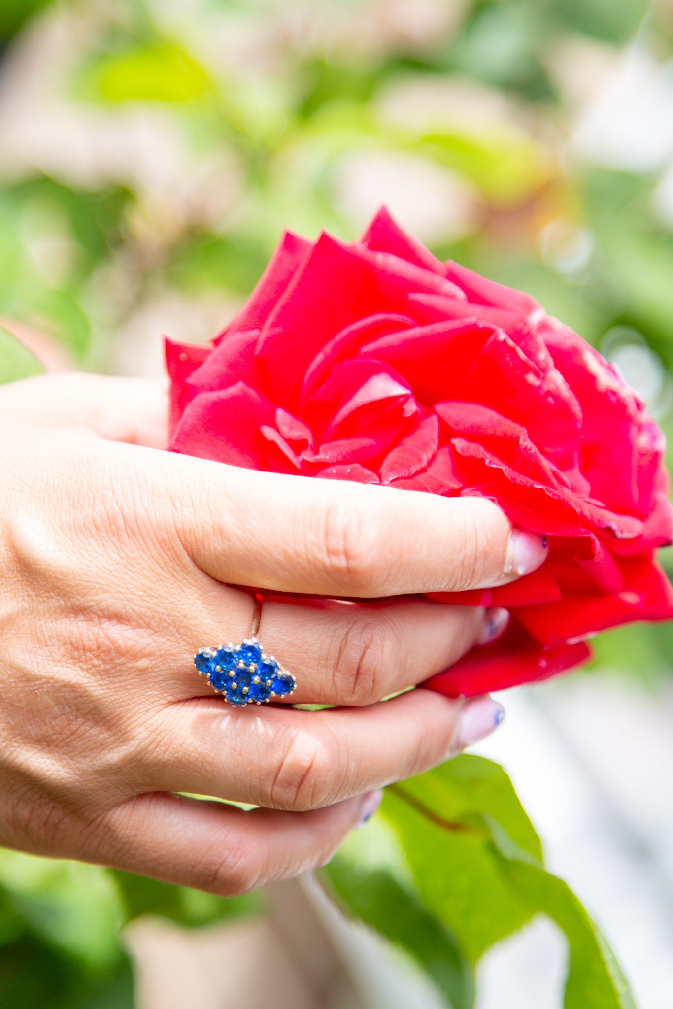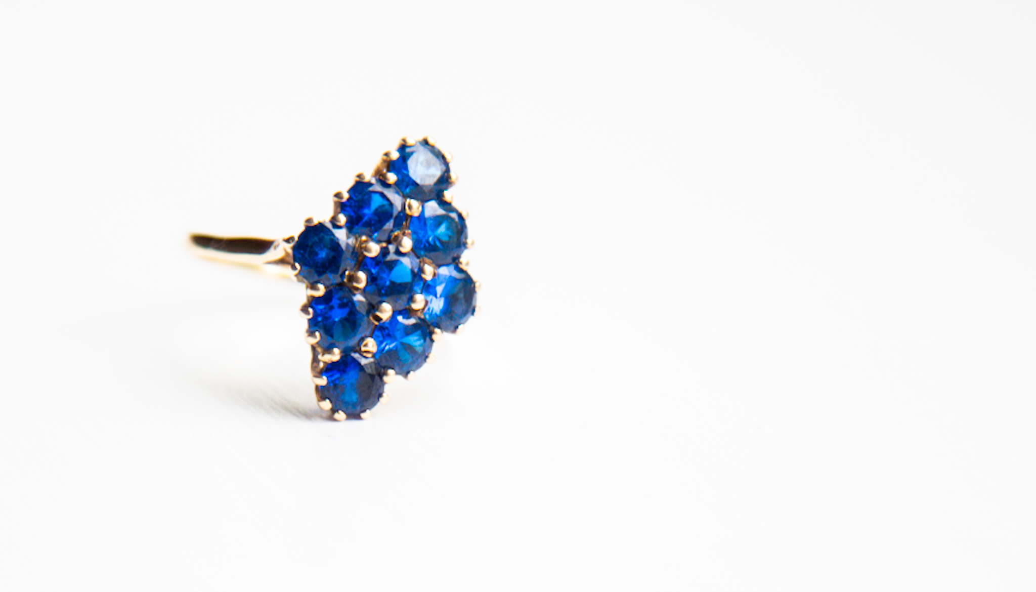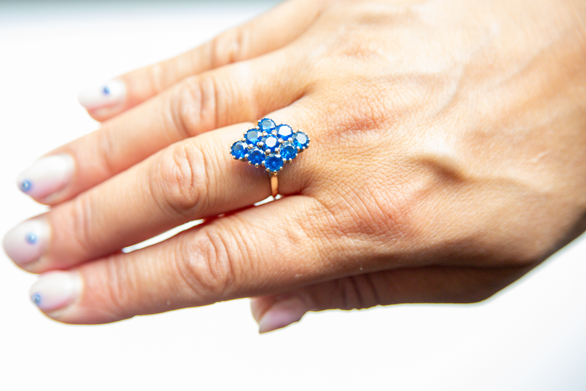 A flower-like assortment of 9 sensible sapphires in gold for the center finger on my proper hand, I’m besotted. Isn’t she superb?