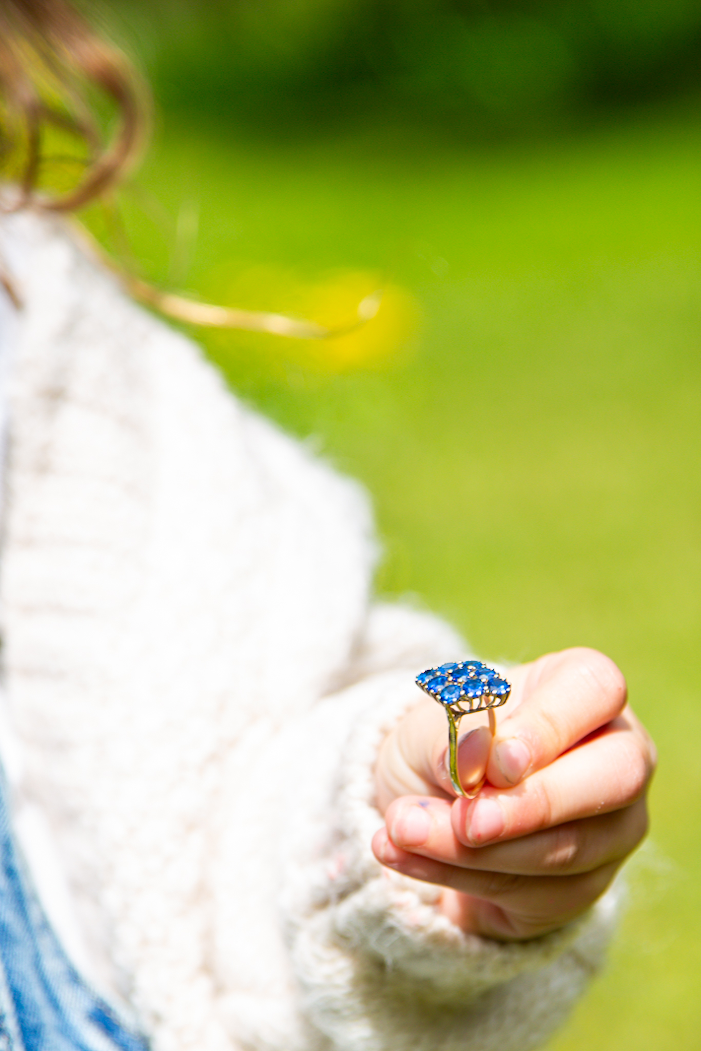A flower-like assortment of 9 sensible sapphires in gold for the center finger on my proper hand, I’m besotted. Isn’t she superb?