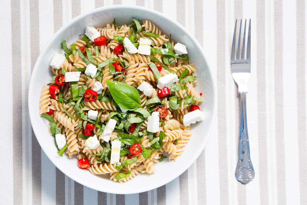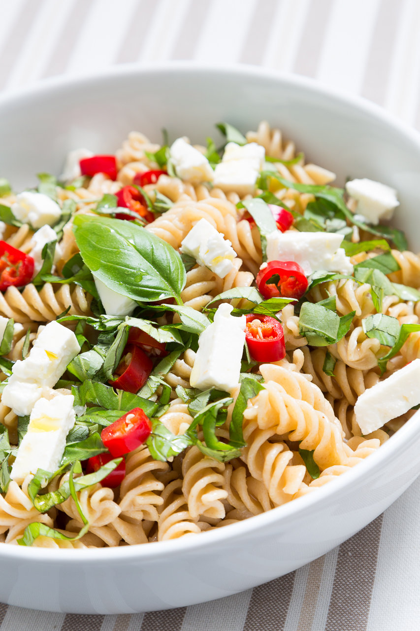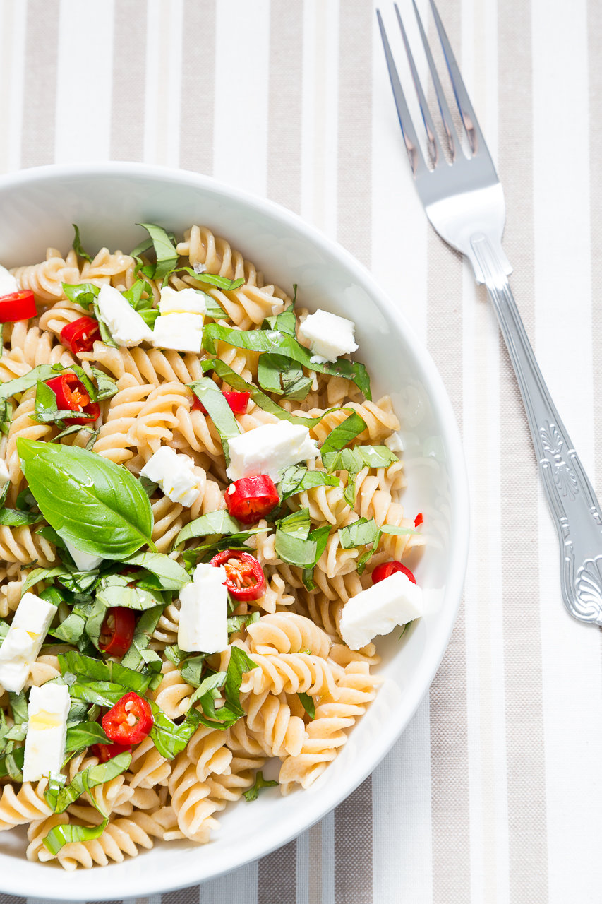 Wholewheat fusilli pasta with chopped basil, raw red chilli, feta cheese and drizzle with olive oil
